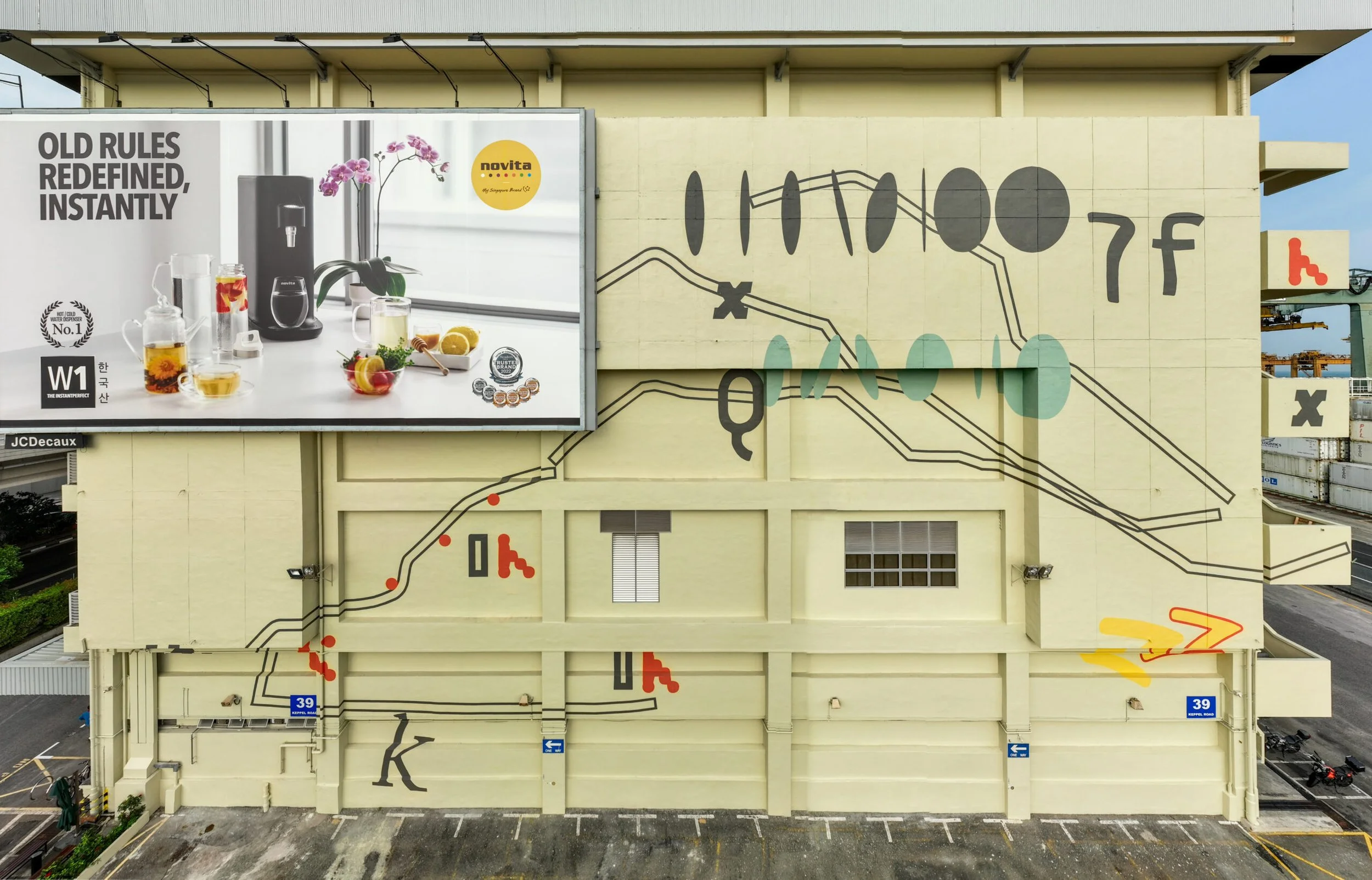 In Prove You Are Human, the use of vector graphics on the façade of the Singapore Art Museum embraces a deliberately loose visual syntax, referencing the aesthetic of CAPTCHA codes. Motifs, letters, numerals, and icons are pared down to their essential geometries, functioning as both visual forms and typographic onomatopoeia.