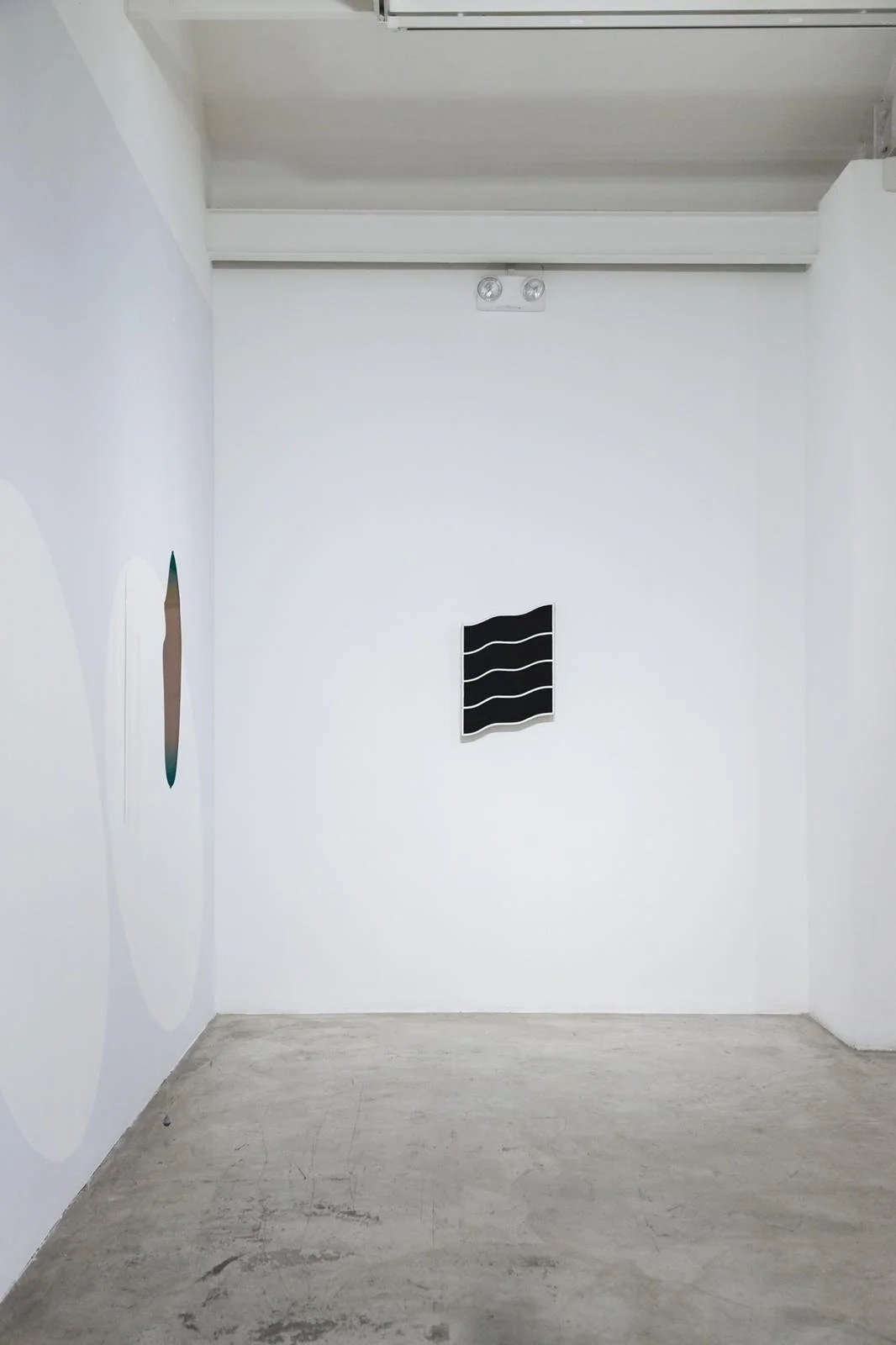 Swivels explores the negotiation of painting as object, maintaining an ongoing dialogue with flatness and restraint. Mounted on steel brackets, these shaped paintings rotate, revealing their various facets and components. While sculpture is often apprehended in relation to the human body, this work proposes a more mutable encounter—its capacity to swivel suggests a quiet choreography of confrontation and withdrawal. The tension of such controlled movement, especially in close proximity to the wall, becomes intrinsic to the work’s affect.